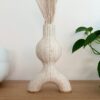 This unique ceramic dried flower vase features donut shaped legs and a bulbous body, and its fluted vertical stripes add texture and dimention to this one-of-a-kind piece. Made with brown speckled clay using a combination of wheel throwing and hand-building, and dipped in oatmeal (off-white)-colored glaze that allows the natural speckles from the sand in the clay to show through. The bottom rim of the vase is left unglazed. Dishwasher and microwave-safe. Please note that this vase is open on the bottom of the legs, so can’t hold water – it’s made for displaying dried botanicals, or even a small air plant.
