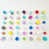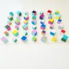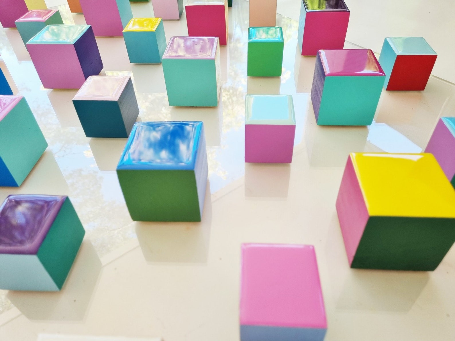 Original and unique work in wood with resin finish. Each cube is a unique little work of art. Hand cut and painted with random color on a grid layout